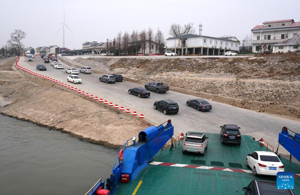 Vehicles are transported onto Mianchuan Island via ferry, in Jiujiang City, east China's Jiangxi Province, Jan. 29, 2026. Mianchuan Island, located in the Jiangxi section of the Yangtze River and surrounded by water, covers an area of 104 square kilometers. It can be reached by a ten-minute ferry ride from Madang Ferry Terminal in Jiujiang City. (Xinhua/Wan Xiang)