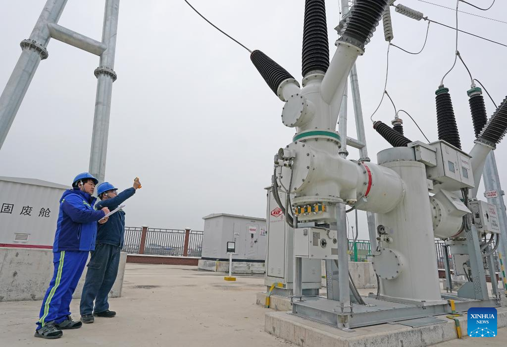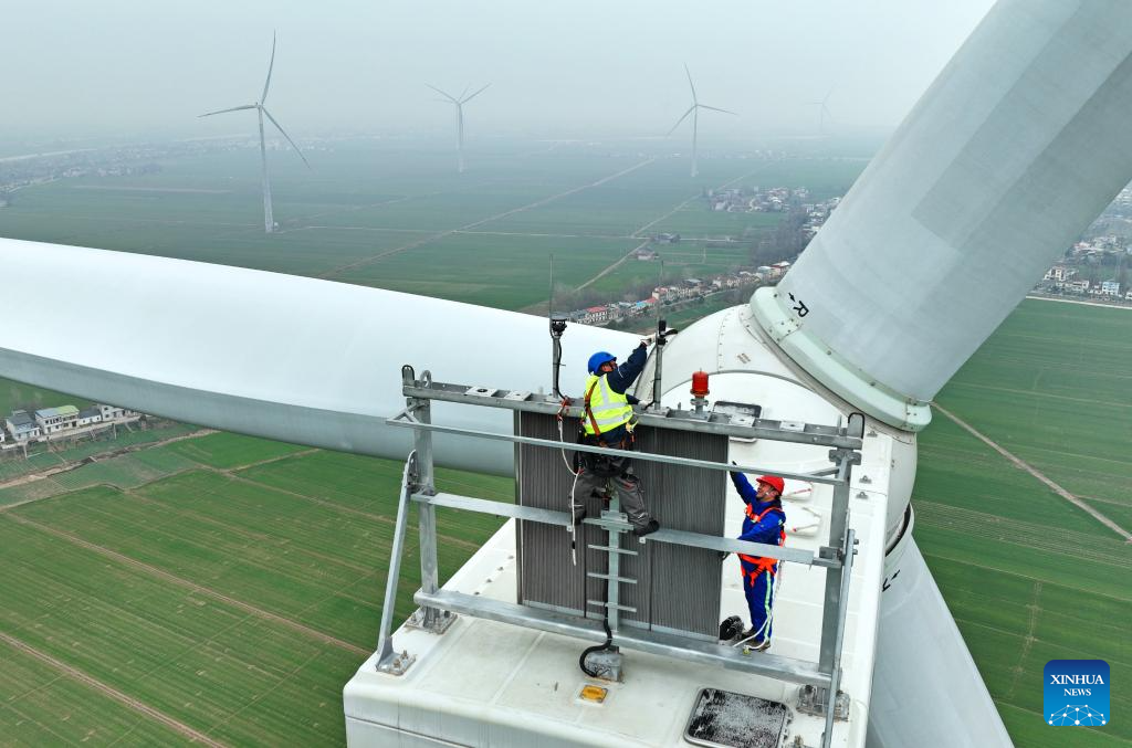 Staff members inspect the operational status of transformers of the wind power plant on Mianchuan Island of Jiujiang City, east China's Jiangxi Province, Jan. 29, 2026. Mianchuan Island, located in the Jiangxi section of the Yangtze River and surrounded by water, covers an area of 104 square kilometers. It can be reached by a ten-minute ferry ride from Madang Ferry Terminal in Jiujiang City. (Xinhua/Wan Xiang)