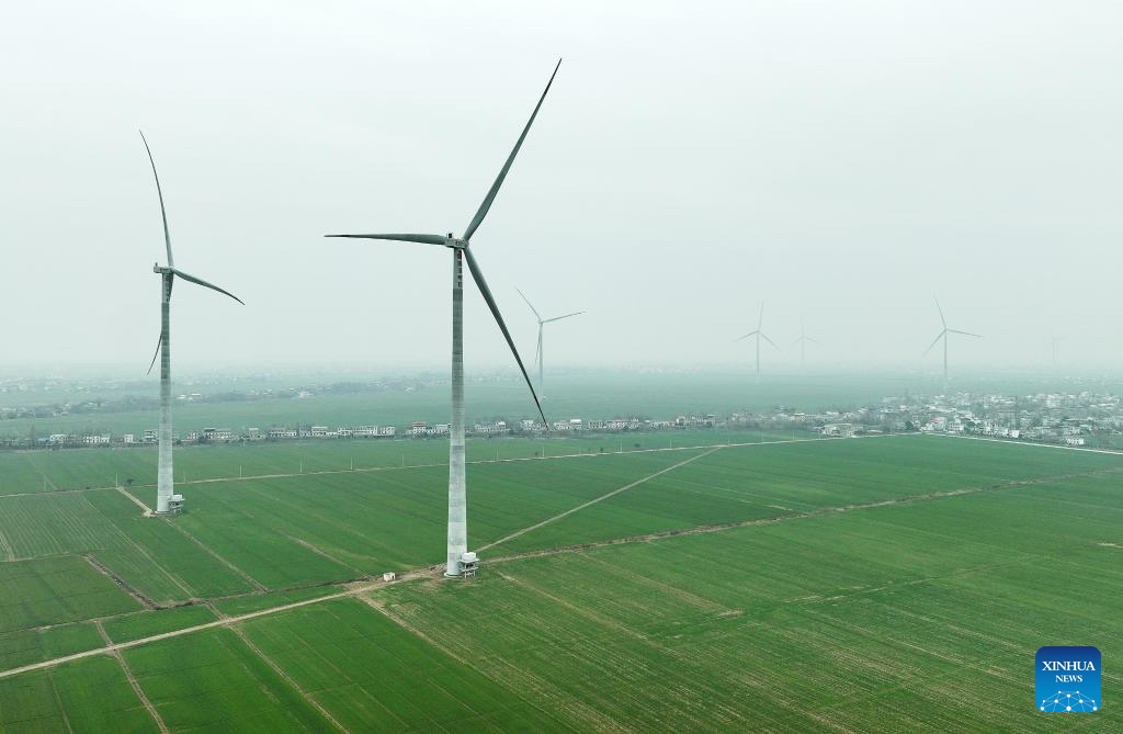 This drone photo shows the wind turbines on Mianchuan Island of Jiujiang City, east China's Jiangxi Province, Jan. 29, 2026. Mianchuan Island, located in the Jiangxi section of the Yangtze River and surrounded by water, covers an area of 104 square kilometers. It can be reached by a ten-minute ferry ride from Madang Ferry Terminal in Jiujiang City. (Xinhua/Wan Xiang)