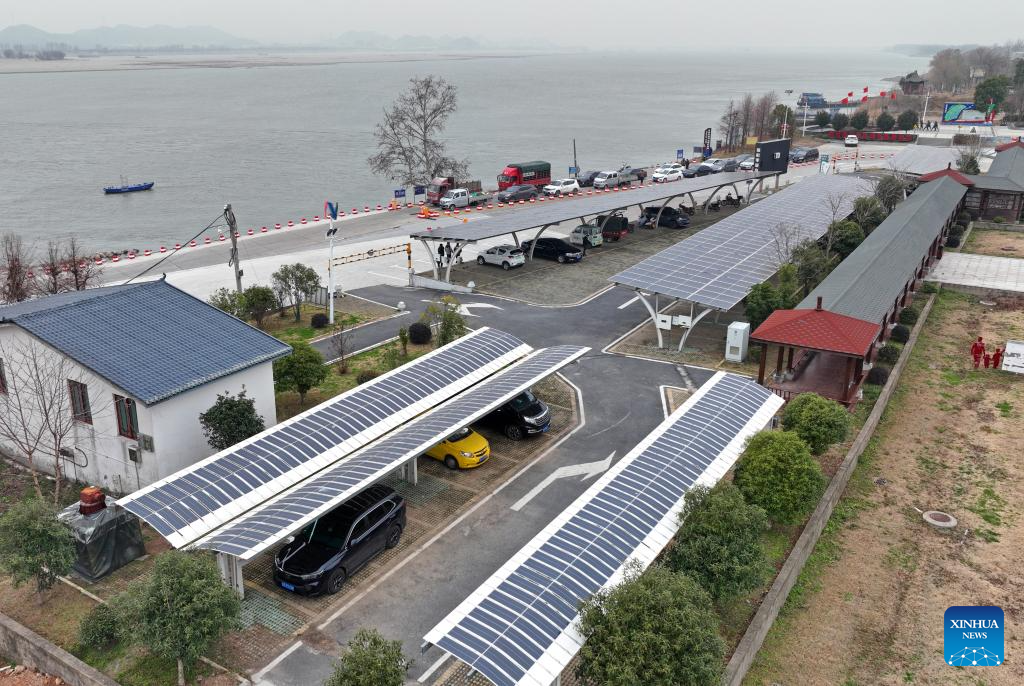A drone photo shows photovoltaic carports on Mianchuan Island of Jiujiang City, east China's Jiangxi Province, Jan. 29, 2026. Mianchuan Island, located in the Jiangxi section of the Yangtze River and surrounded by water, covers an area of 104 square kilometers. It can be reached by a ten-minute ferry ride from Madang Ferry Terminal in Jiujiang City. (Xinhua/Wan Xiang)