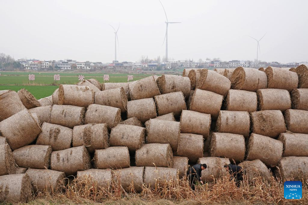 Workers prepare to transport the collected straw on Mianchuan Island off the island for recycling, in Jiujiang City, east China's Jiangxi Province, Jan. 29, 2026. Mianchuan Island, located in the Jiangxi section of the Yangtze River and surrounded by water, covers an area of 104 square kilometers. It can be reached by a ten-minute ferry ride from Madang Ferry Terminal in Jiujiang City. (Xinhua/Wan Xiang)