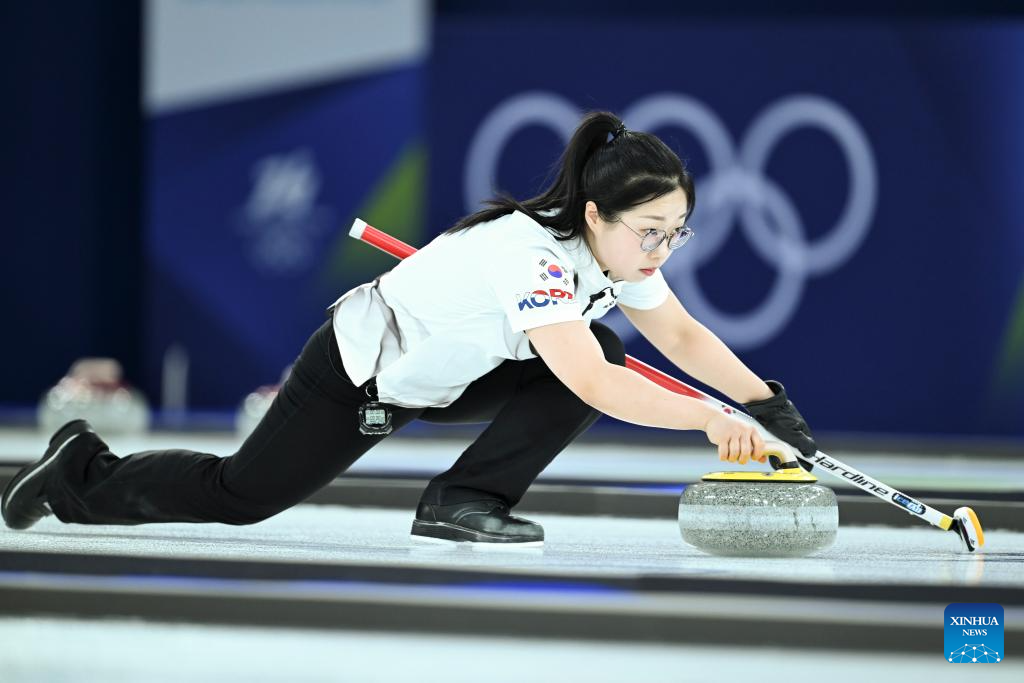 Kim Seonyeong of South Korea competes during the curling mixed doubles round robin session 4 match between South Korea and Switzerland of the 2026 Milan-Cortina Winter Olympics in Cortina D'Ampezzo, Italy, Feb. 5, 2026. (Xinhua/Lian Yi)