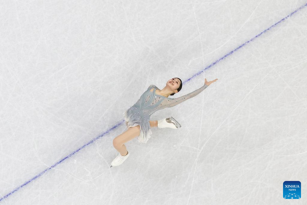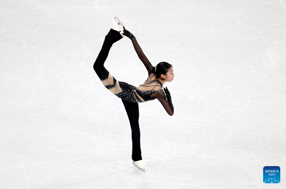Zhang Ruiyang of China performs during the women single skating short program of the figure skating team event of the Milan-Cortina 2026 Olympic Winter Games in Milan, Italy, Feb. 6, 2026. (Xinhua/Cheng Min)