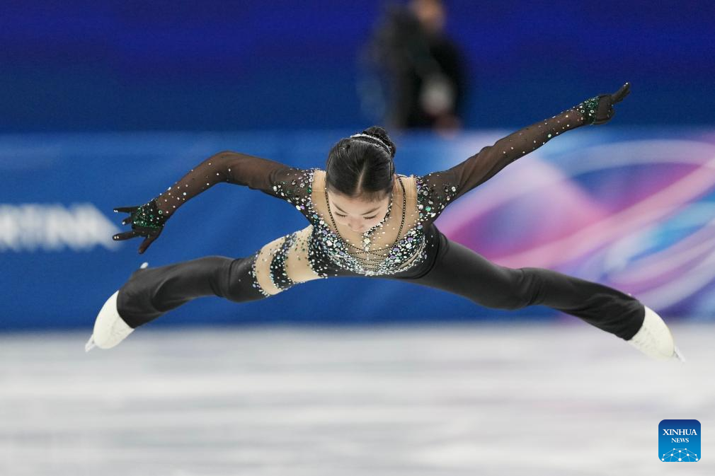 Zhang Ruiyang of China performs during the women single skating short program of the figure skating team event of the Milan-Cortina 2026 Olympic Winter Games in Milan, Italy, Feb. 6, 2026. (Xinhua/Chen Yichen)