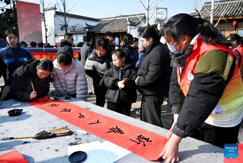 Students write spring couplets in an event celebrating the upcoming Spring Festival at a bookstore in Xinghua City, east China's Jiangsu Province, on Feb. 7, 2026. Various extracurricular activities are available for students across China during the winter vacation. (Photo by Zhou Shegen/Xinhua)
