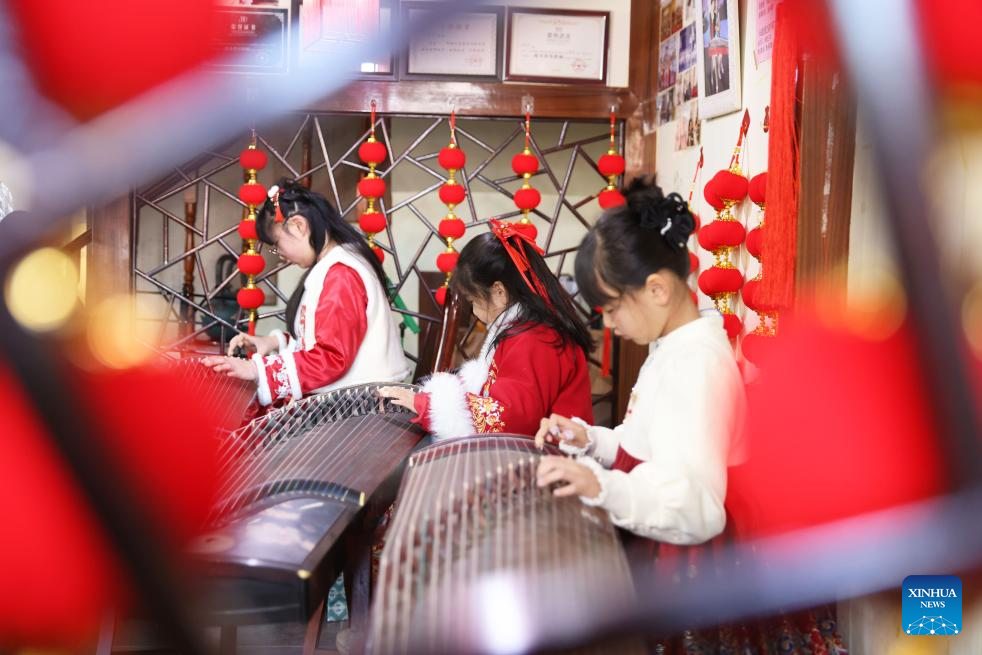 Children practice playing guzheng at a music store in Deqing County of Huzhou, east China's Zhejiang Province, on Feb. 8, 2026. Various extracurricular activities are available for students across China during the winter vacation. (Photo by Ni Lifang/Xinhua)