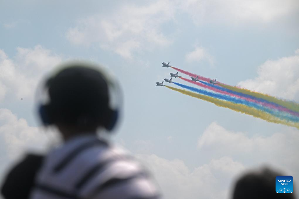 People watch an aircraft performance by the Bayi Aerobatic Team of the Chinese People's Liberation Army (PLA) Air Force during the 10th Singapore Airshow in Singapore, Feb. 7, 2026. (Photo by Then Chih Wey/Xinhua)