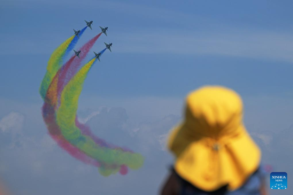 Aircraft of the Bayi Aerobatic Team of the Chinese People's Liberation Army (PLA) Air Force perform during the 10th Singapore Airshow in Singapore, Feb. 7, 2026. (Photo by Then Chih Wey/Xinhua)