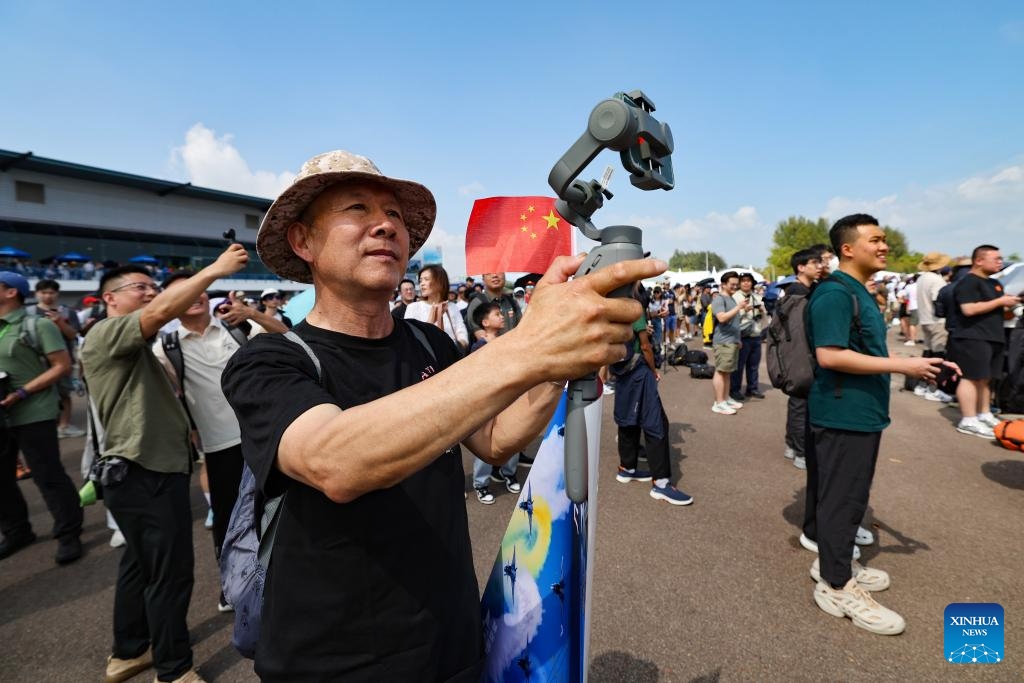 People watch aircraft performance by Chinese PLA aerobatic team at Singapore Airshow