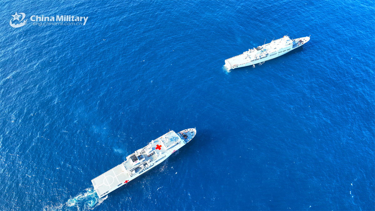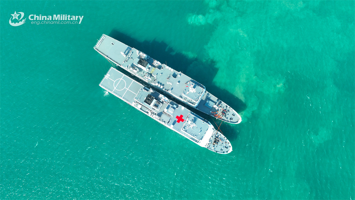 Hospital ship Youai (Hull 861) and transport ship Nanyun 831 attached to a flotilla with the navy under the Chinese PLA Southern Theater Command conduct alongside replenishment-at-sea operation during a multi-subject training exercise in waters of the South China Sea. (eng.chinamil.com.cn/Photo by Wu Huangqing)