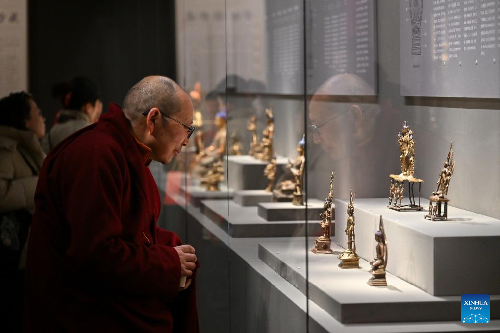 People visit the exhibition "Beyond Time: the history, culture and art of Sakya Monastery" at the Palace Museum in Beijing, capital of China, Feb. 9, 2026. The exhibition, which will last till May 10, showcases over 200 relics reflecting the history, culture and art of Sakya Monastery, the earliest monastery of the Sakya Sect of the Tibetan Buddhism. (Xinhua/Li Xin)