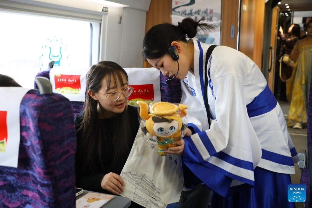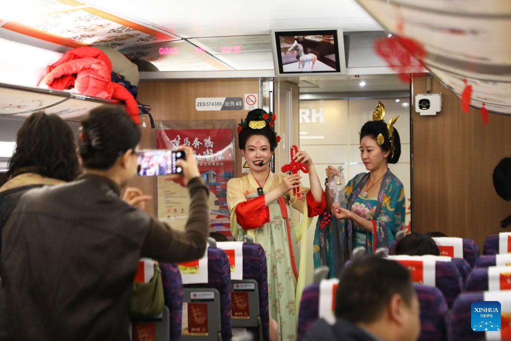 Museum staff members introduce cultural knowledge to passengers aboard the train G848 in northwest China's Gansu Province, Feb. 9, 2026. As part of the mobile museum on the high-speed railway program, the train G848, carrying cultural relics interpreters, departed from Lanzhou West Railway Station heading to Guangzhou South Railway Station on Monday.