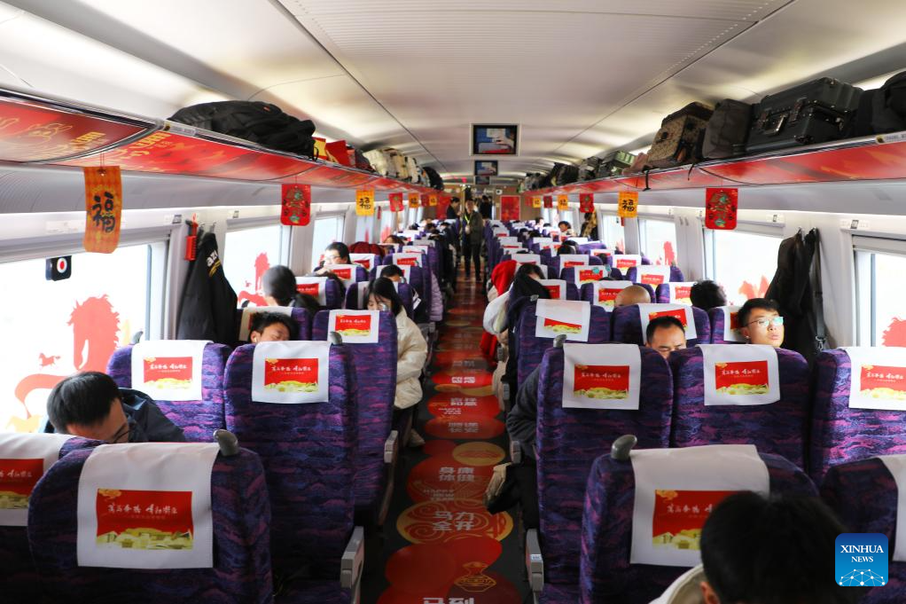 Passengers take the train G848 in northwest China's Gansu Province, Feb. 9, 2026. As part of the mobile museum on the high-speed railway program, the train G848, carrying cultural relics interpreters, departed from Lanzhou West Railway Station heading to Guangzhou South Railway Station on Monday.