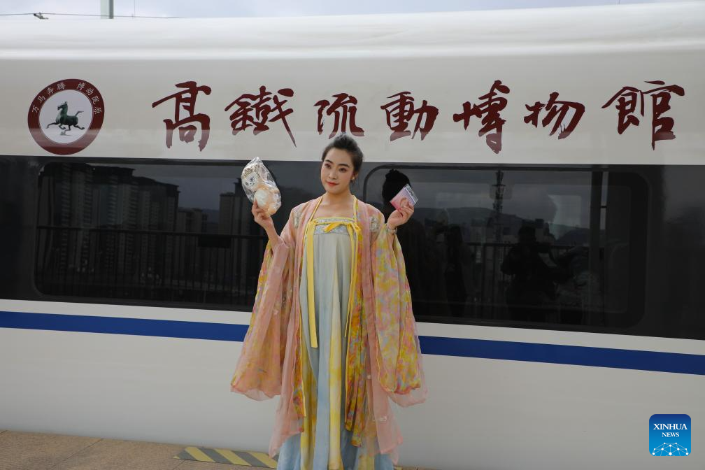 A museum staff member displays cultural and creative products at a railway station in Qin'an County of Tianshui City, northwest China's Gansu Province, Feb. 9, 2026. As part of the mobile museum on the high-speed railway program, the train G848, carrying cultural relics interpreters, departed from Lanzhou West Railway Station heading to Guangzhou South Railway Station on Monday.