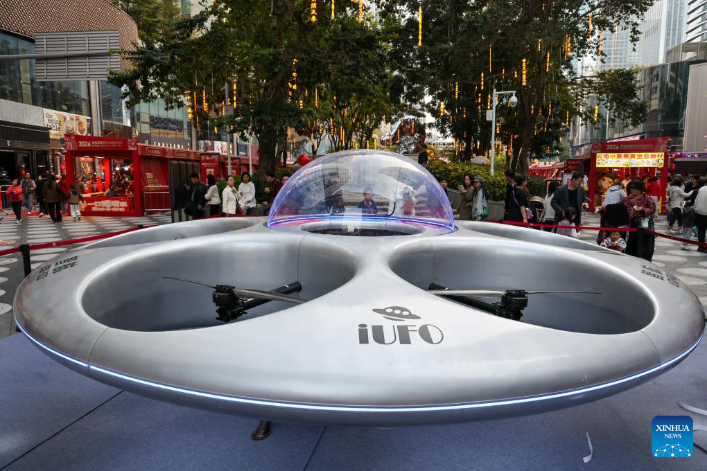 A flying saucer-shaped electric vertical takeoff and landing (eVTOL) aircraft is pictured at a flower market in Futian District of Shenzhen, south China's Guangdong Province, on Feb. 10, 2026. The 2026 Spring Festival flower market opened in Shenzhen on Tuesday, with major flower markets and convenient flower stores set up in all districts of the city to facilitate citizens' purchase of flowers and new year's goods for the festival. (Xinhua/Liang Xu)
