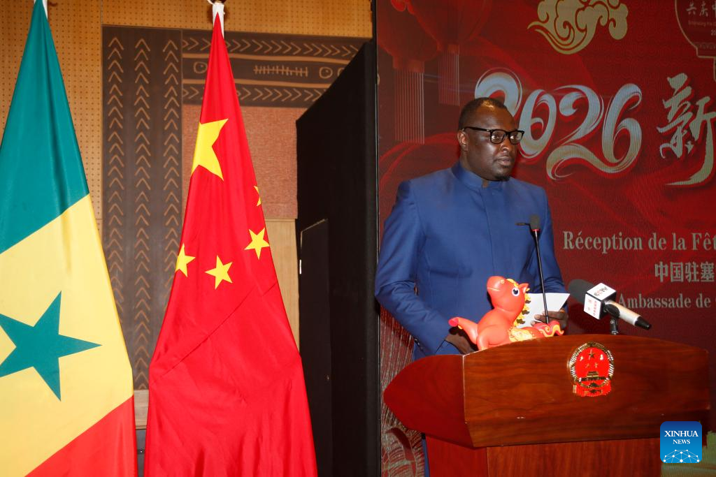Senegal's Secretary of State for Senegalese Abroad Amadou Cherif Diouf delivers a speech at a Spring Festival reception in Dakar, capital of Senegal, Feb. 9, 2026. (Photo by Aliou Mbaye/Xinhua)