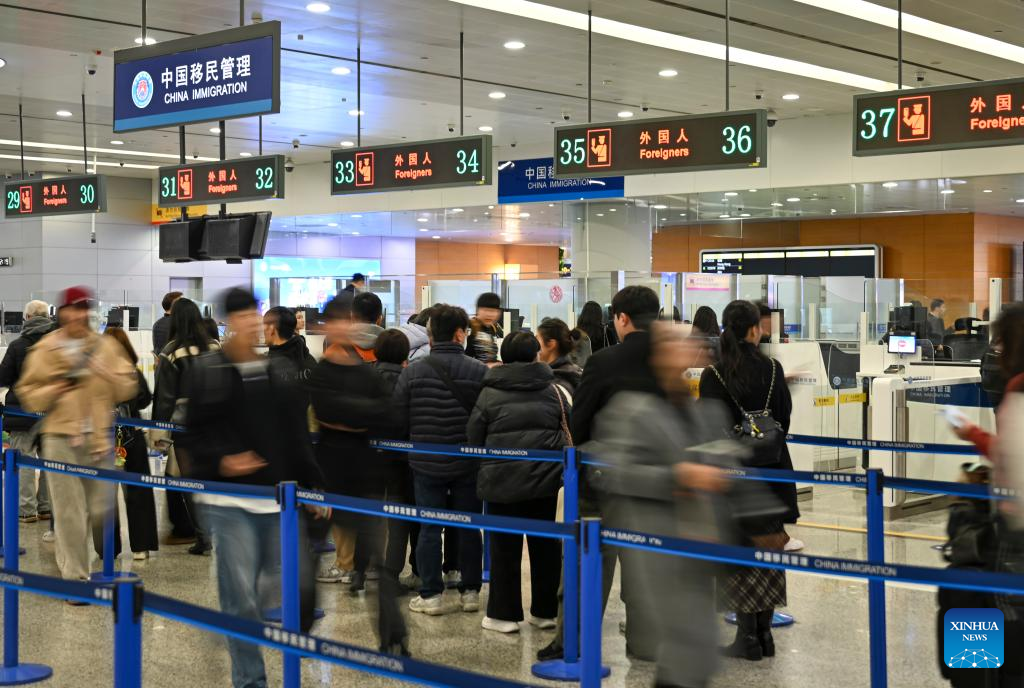 A tourist goes through entry procedures at Shanghai Pudong International Airport in Shanghai, east China, on Feb. 11, 2026. As the Spring Festival approaches, the Shanghai port has witnessed a surge in inbound arrivals. (Xinhua/Chen Haoming)