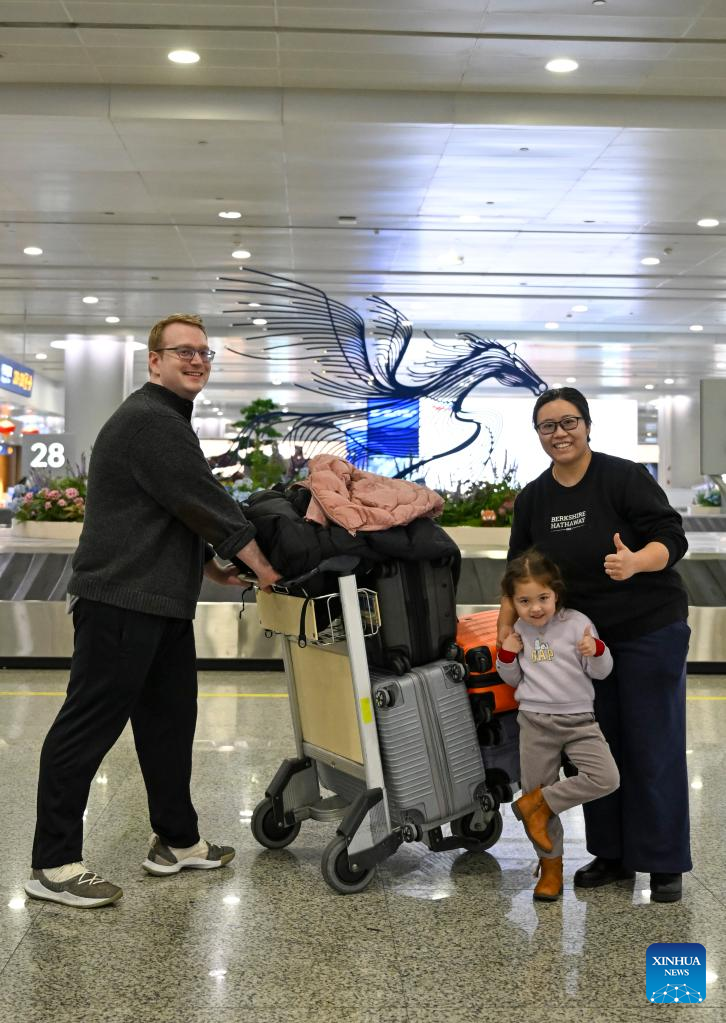A family from the United States pose for photos at Shanghai Pudong International Airport in Shanghai, east China, on Feb. 11, 2026. As the Spring Festival approaches, the Shanghai port has witnessed a surge in inbound arrivals. (Xinhua/Chen Haoming)