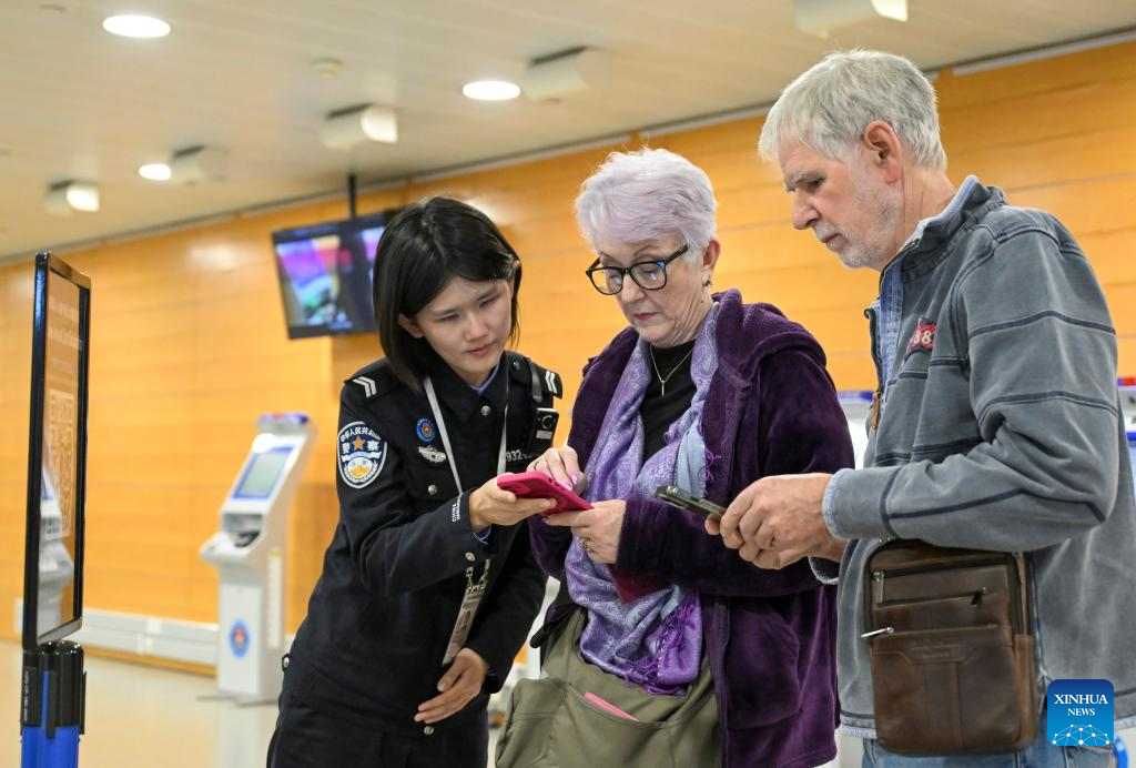 A border inspection police officer helps foreign tourists fill in entry information at Shanghai Pudong International Airport in Shanghai, east China, on Feb. 11, 2026. As the Spring Festival approaches, the Shanghai port has witnessed a surge in inbound arrivals. (Xinhua/Chen Haoming)
