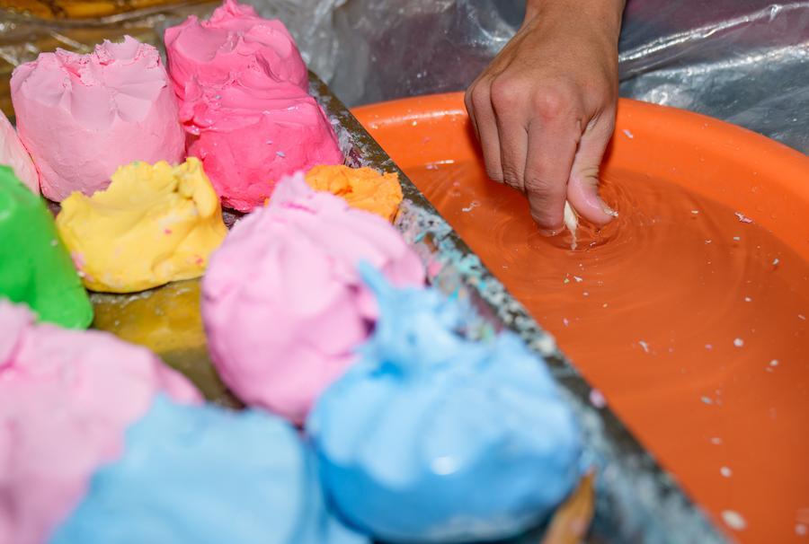 A craftsman kneads butter in cold water to cool and shape the butter at a workshop in Lhasa, southwest China's Xizang Autonomous Region, Feb. 12, 2026. (Xinhua/Tenzin Nyida)