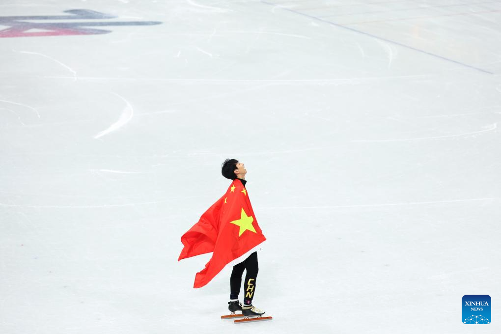 Sun Long of China celebrates after the short track speed skating men's 1000m final A at the Milan-Cortina 2026 Olympic Winter Games in Milan, Italy, Feb. 12, 2026. (Xinhua/Xue Yuge)