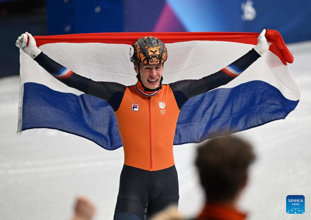 Jens van 'T Wout of the Netherlands celebrates after the short track speed skating men's 1000m final A at the Milan-Cortina 2026 Olympic Winter Games in Milan, Italy, Feb. 12, 2026. (Xinhua/Cheng Min)