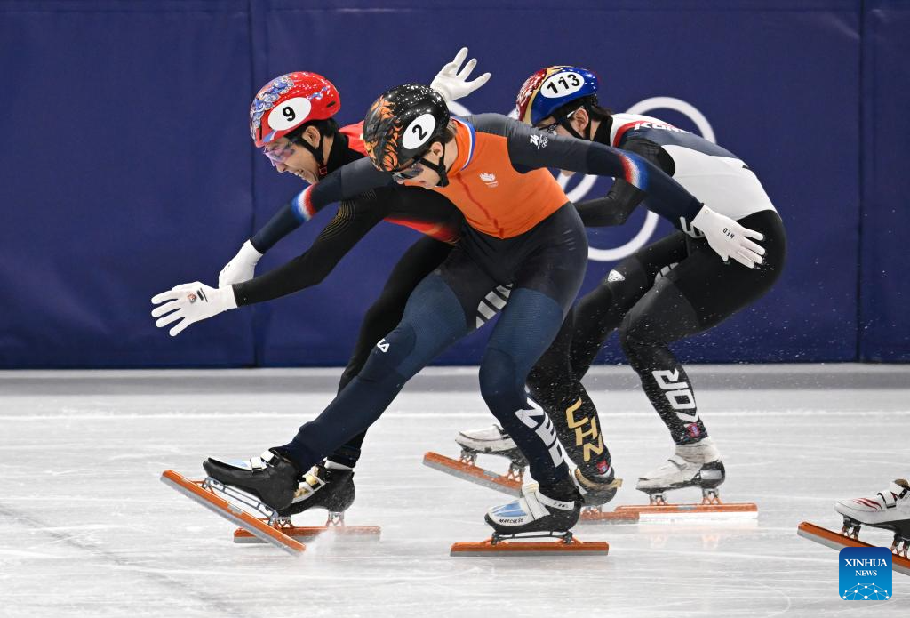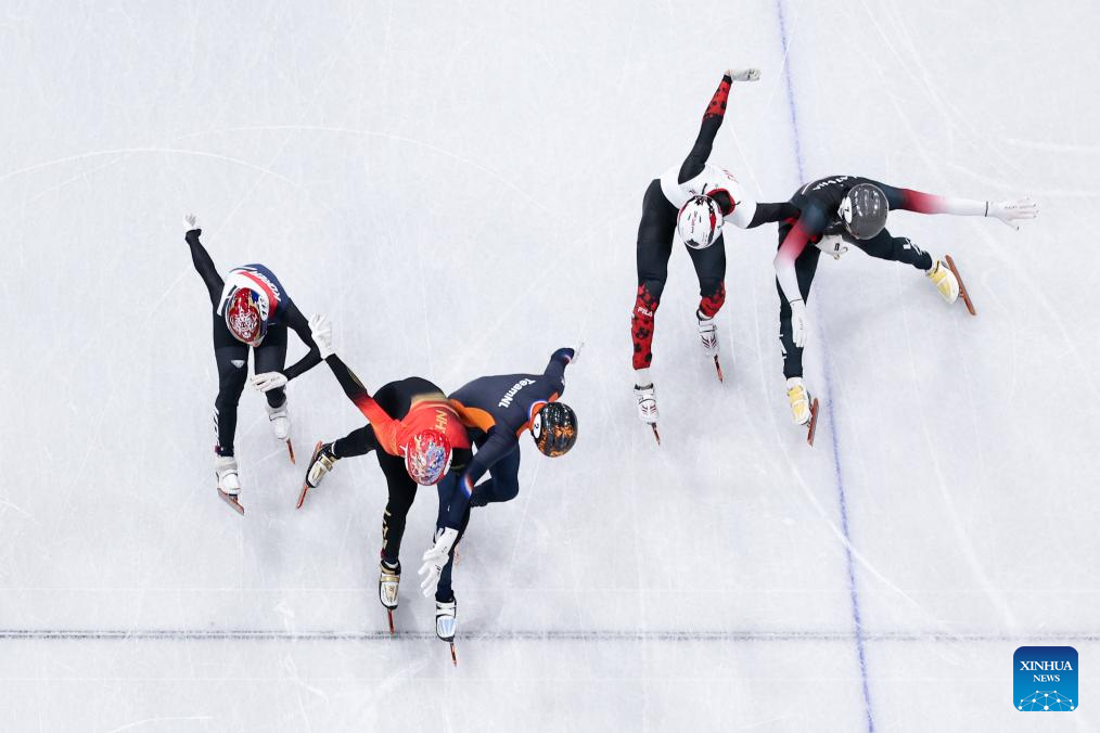 Athletes compete during the short track speed skating men's 1000m final A at the Milan-Cortina 2026 Olympic Winter Games in Milan, Italy, Feb. 12, 2026. (Xinhua/Chen Yichen)