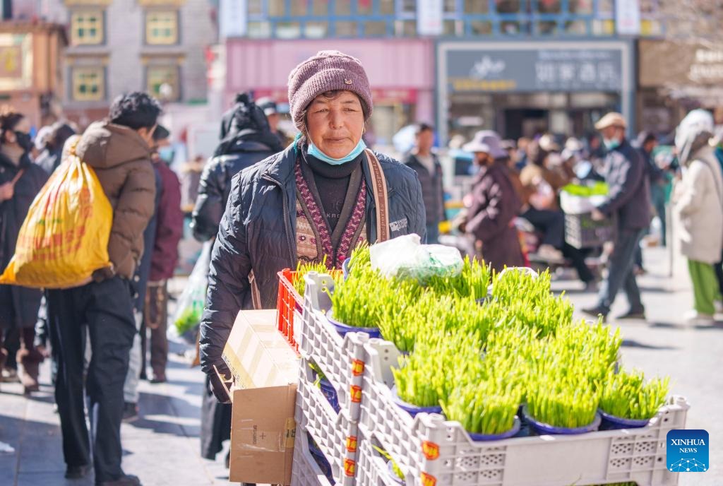 A vendor sells highland barley seedlings at a market in Lhasa, southwest China's Xizang Autonomous Region, Feb. 15, 2026. With the Spring Festival and the Tibetan New Year right around the corner, market places in Lhasa receive a surge of customers buying goods needed for the holidays. (Xinhua/Tenzin Nyida)
