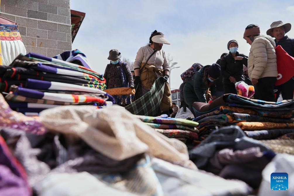People shop at a market in Lhasa, southwest China's Xizang Autonomous Region, Feb. 15, 2026. With the Spring Festival and the Tibetan New Year right around the corner, market places in Lhasa receive a surge of customers buying goods needed for the holidays. (Xinhua/Zhang Licong)