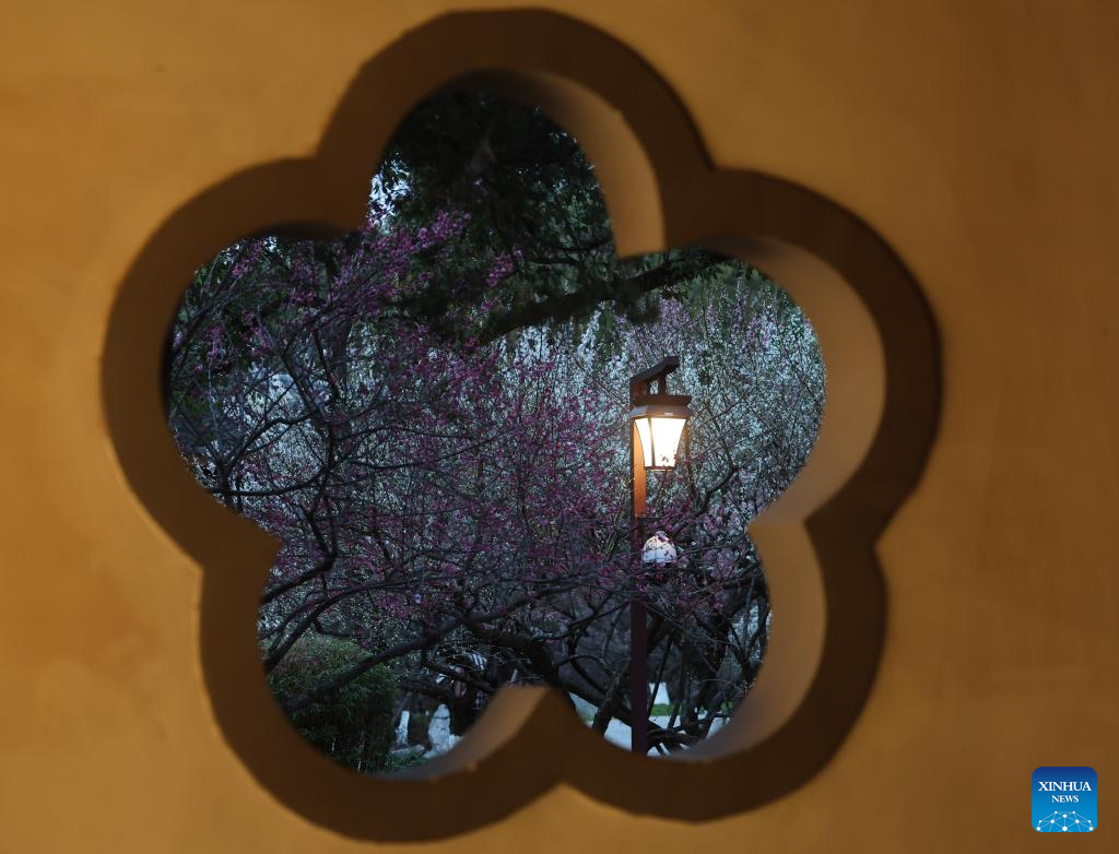 Plum blossoms are pictured at Chaoshan scenic area in Hangzhou, east China's Zhejiang Province, Feb. 23, 2026. The scenic area kicked off on Monday a special night tour event among plum blossom trees illuminated by light. (Xinhua/Xu Yu)