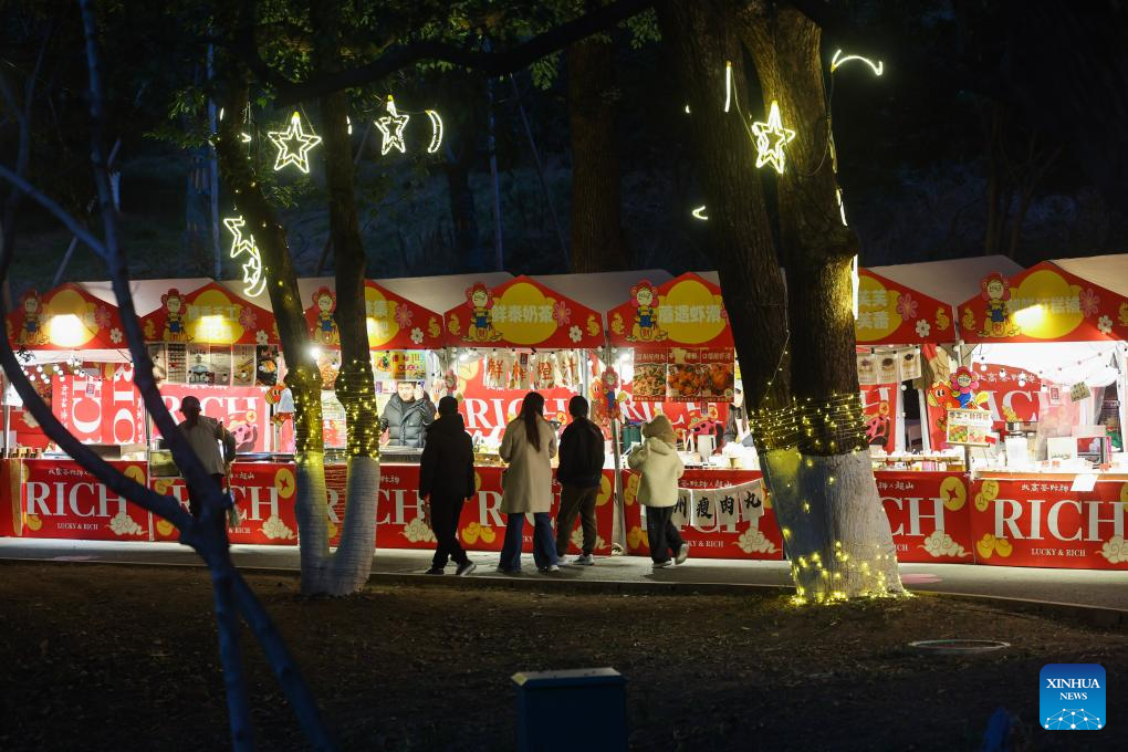 Tourists visit a night market at Chaoshan scenic area in Hangzhou, east China's Zhejiang Province, Feb. 23, 2026. The scenic area kicked off on Monday a special night tour event among plum blossom trees illuminated by light. (Xinhua/Xu Yu)