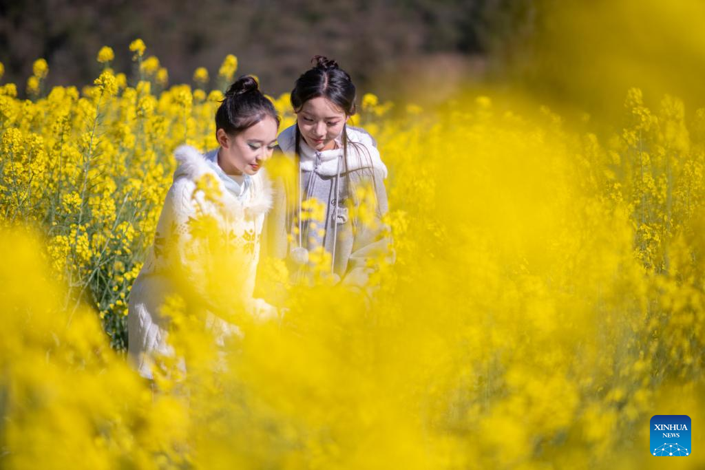 Tourists visit a rapeseed flower field in Shangbugao Village of Maguan County, Wenshan Zhuang and Miao Autonomous Prefecture, southwest China's Yunnan Province, Feb. 22, 2026. (Photo by Xiong Pingxiang/Xinhua)