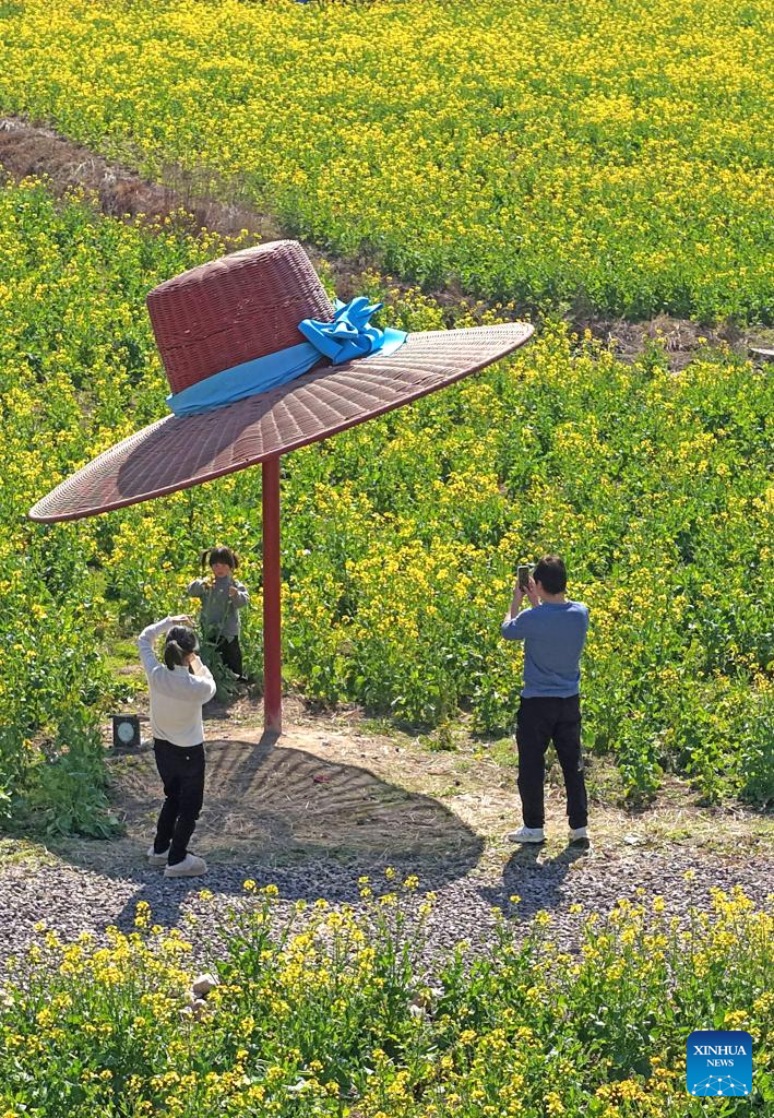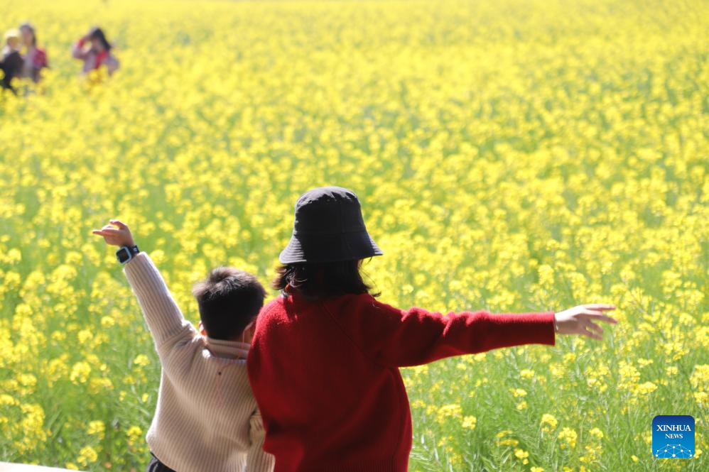 Tourists visit a rapeseed flower field in Tianming Village of Lujia Town, Renshou County, southwest China's Sichuan Province, Feb. 20, 2026. (Photo by Pan Jianyong/Xinhua)