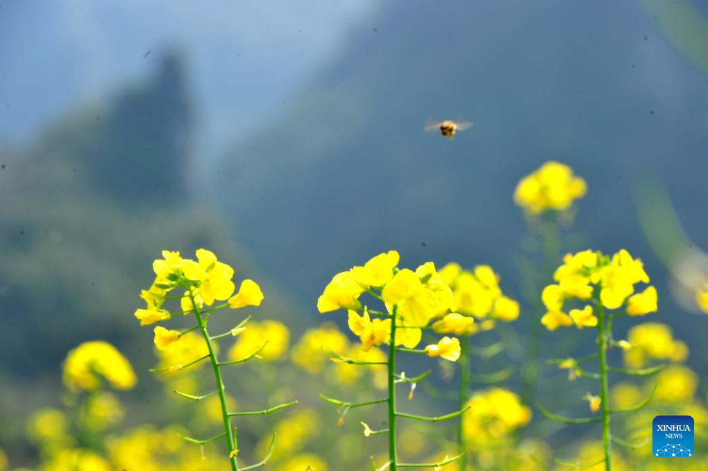 A bee flies over rapeseed flowers in Xinyin Village of Siba Town, Luocheng Mulao Autonomous County, south China's Guangxi Zhuang Autonomous Region, Feb. 20, 2026. (Photo by Wu Yaorong/Xinhua)