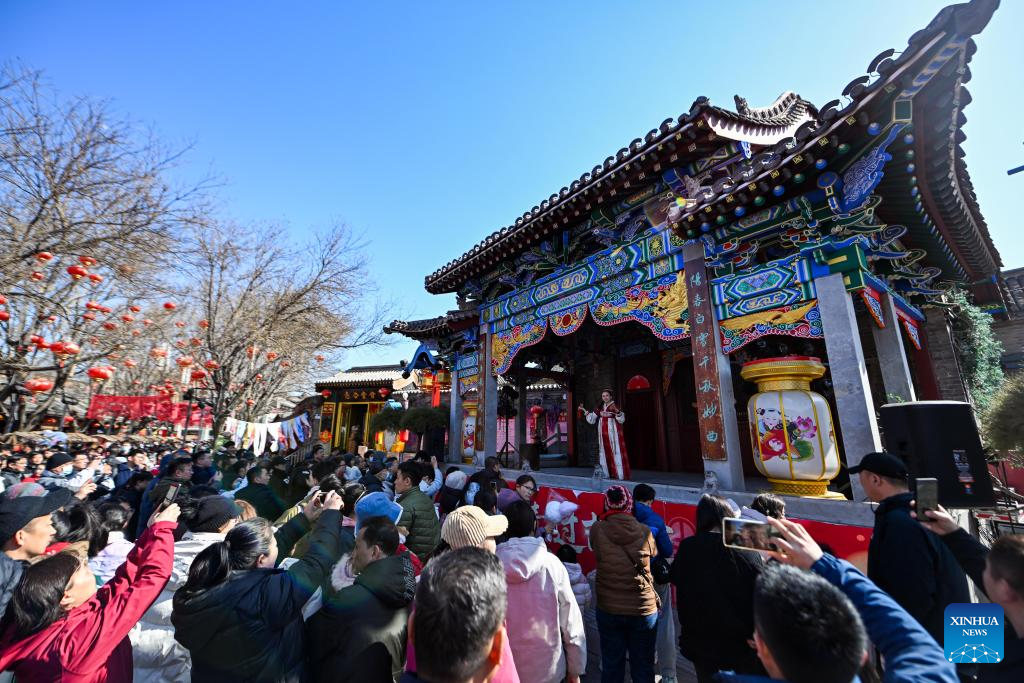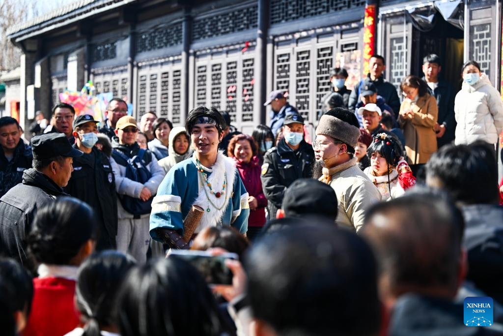 Visitors watch a show at Yangliuqing ancient town in Tianjin, north China, Feb. 22, 2026. Yangliuqing ancient town launched a range of activities featuring folk customs, traditional culture and interactive experiences, offering visitors an immersive folk feast during this Spring Festival holiday. (Xinhua/Zhao Zishuo)