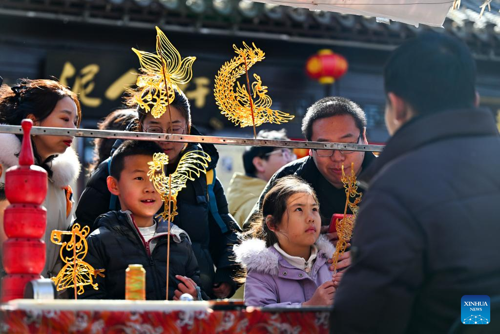Visitors have fun at Yangliuqing ancient town in Tianjin, north China, Feb. 22, 2026. Yangliuqing ancient town launched a range of activities featuring folk customs, traditional culture and interactive experiences, offering visitors an immersive folk feast during this Spring Festival holiday. (Xinhua/Zhao Zishuo)