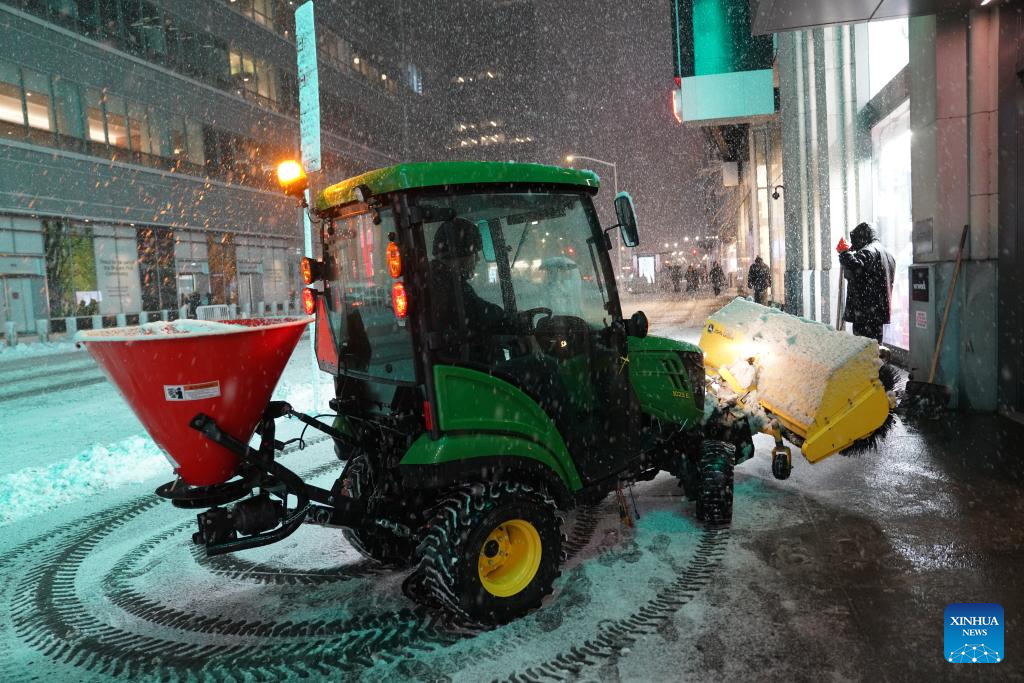 A snowplow clears the sidewalk in snow in New York, the United States, on Feb. 22, 2026. New York City (NYC) Mayor Zohran Mamdani on Sunday declared a state of emergency and issued a travel ban as a winter storm hit the region, causing hundreds of flight cancellations. (Xinhua/Zhang Fengguo)