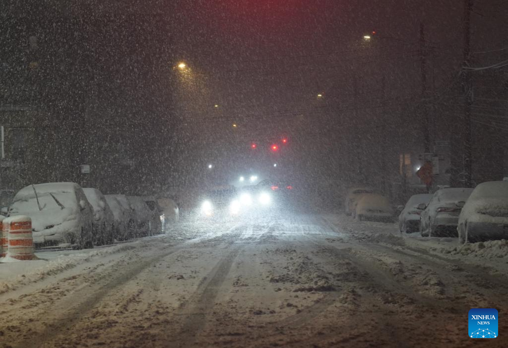 Vehicles run in snow on a street in New York, the United States, on Feb. 22, 2026. New York City (NYC) Mayor Zohran Mamdani on Sunday declared a state of emergency and issued a travel ban as a winter storm hit the region, causing hundreds of flight cancellations. (Xinhua/Zhang Fengguo)