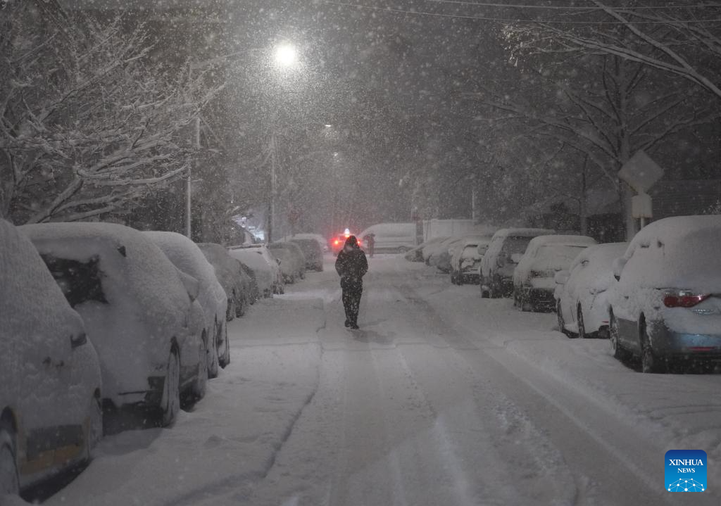 A man walks in snow on a street in New York, the United States, on Feb. 22, 2026. New York City (NYC) Mayor Zohran Mamdani on Sunday declared a state of emergency and issued a travel ban as a winter storm hit the region, causing hundreds of flight cancellations. (Xinhua/Zhang Fengguo)