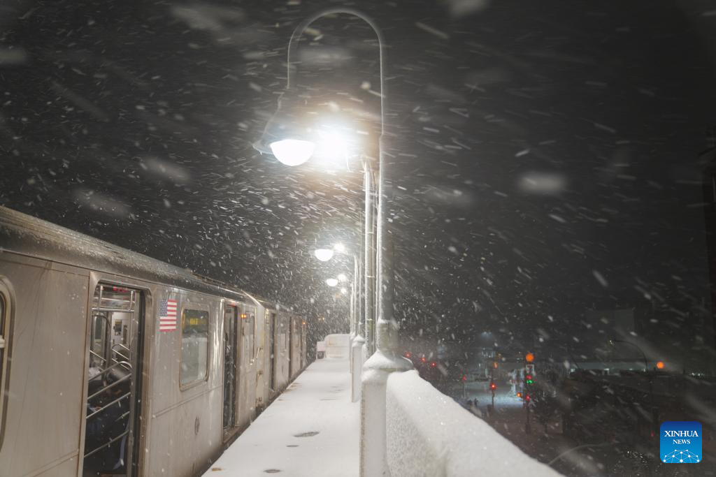 A subway station is seen in snow in New York, the United States, on Feb. 22, 2026. New York City (NYC) Mayor Zohran Mamdani on Sunday declared a state of emergency and issued a travel ban as a winter storm hit the region, causing hundreds of flight cancellations. (Xinhua/Zhang Fengguo)