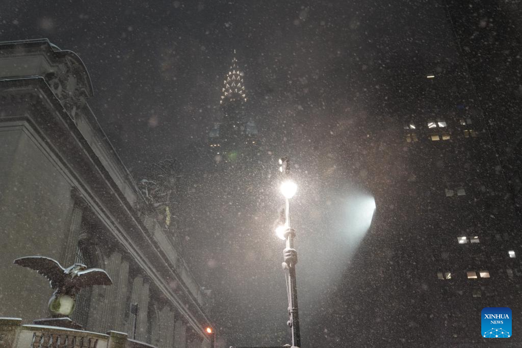 The Grand Central Station and other iconic buildings are seen in snow in New York, the United States, on Feb. 22, 2026. New York City (NYC) Mayor Zohran Mamdani on Sunday declared a state of emergency and issued a travel ban as a winter storm hit the region, causing hundreds of flight cancellations. (Xinhua/Zhang Fengguo)