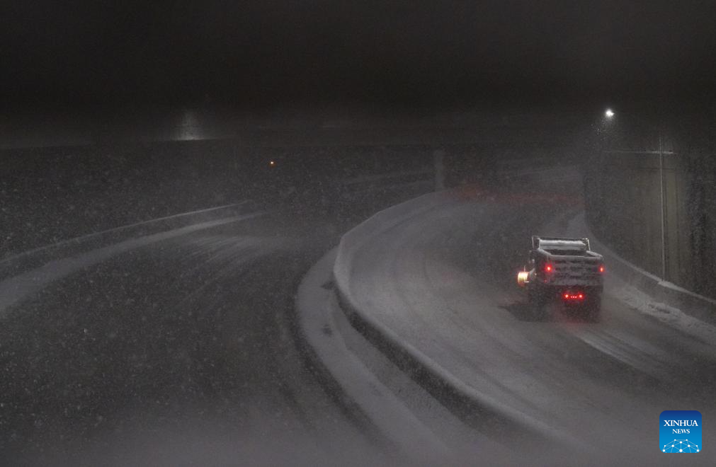 A closed highway is seen in snow in New York, the United States, on Feb. 22, 2026. New York City (NYC) Mayor Zohran Mamdani on Sunday declared a state of emergency and issued a travel ban as a winter storm hit the region, causing hundreds of flight cancellations. (Xinhua/Zhang Fengguo)