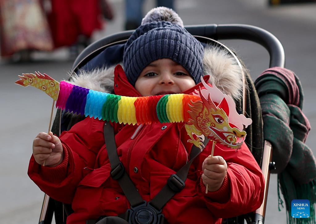 A child is pictured during the Chinese New Year celebration at Trafalgar Square in London, Britain, on Feb. 22, 2026. (Xinhua/Li Ying)