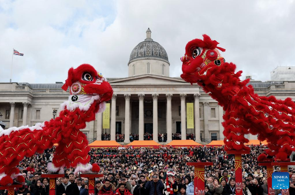 Lion dancers perform at Trafalgar Square to celebrate the Chinese New Year in London, Britain, on Feb. 22, 2026. (Xinhua/Li Ying)