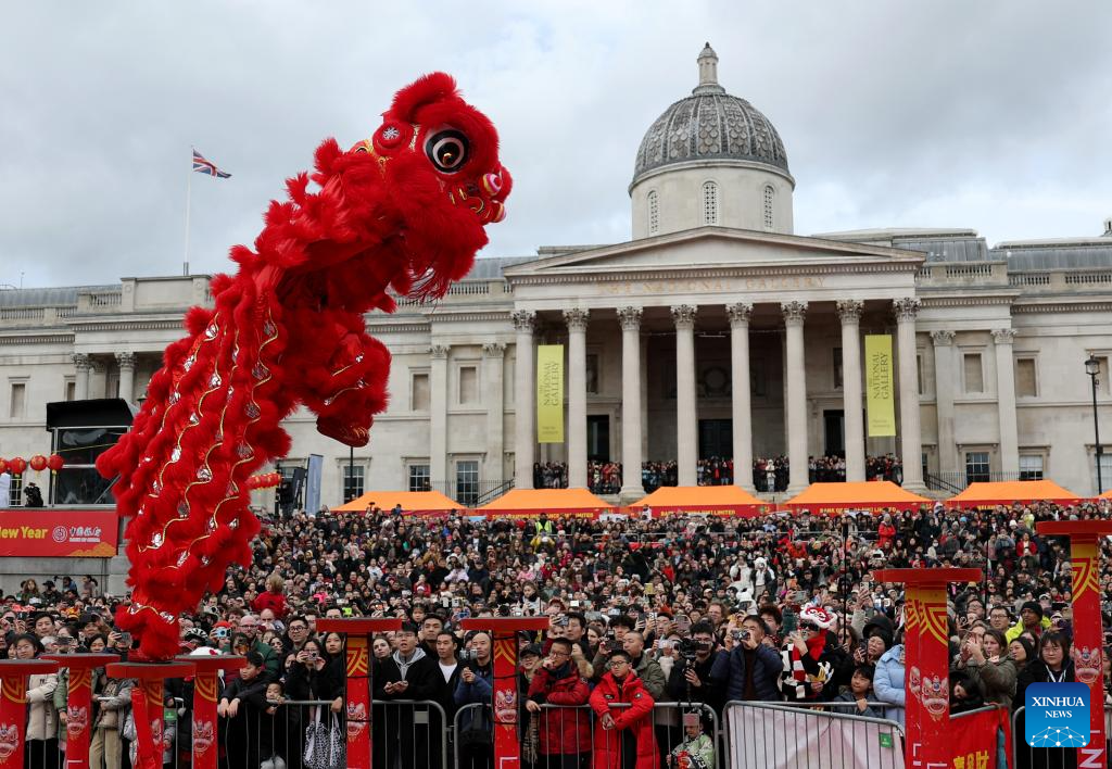 A lion dance is staged at Trafalgar Square to celebrate the Chinese New Year in London, Britain, on Feb. 22, 2026. (Xinhua/Li Ying)