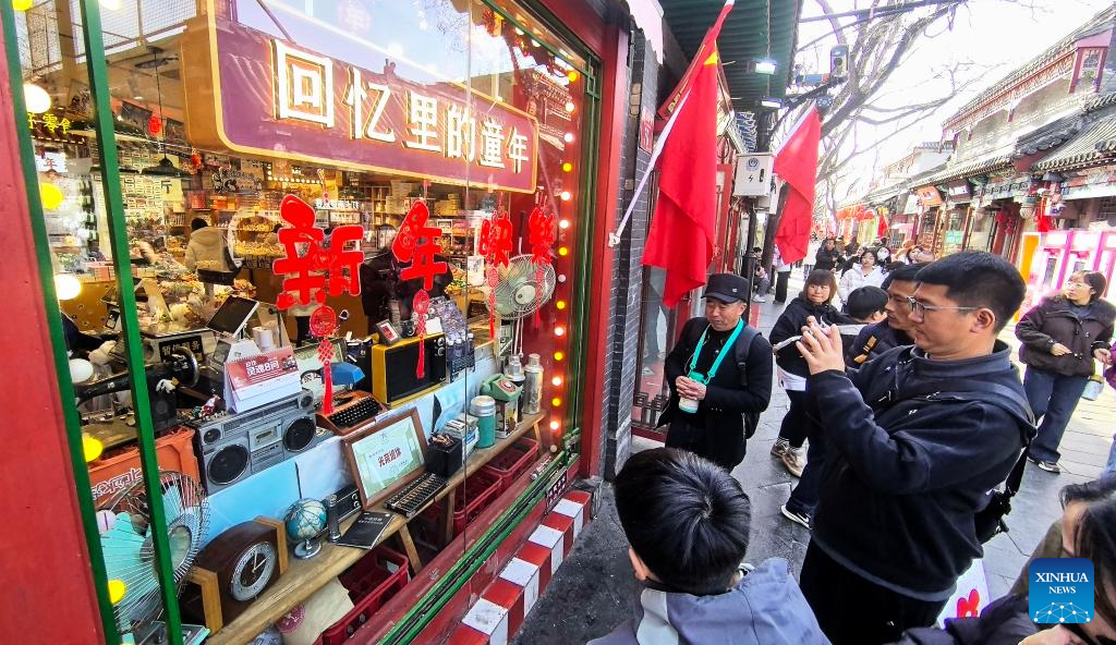 Tourists buy souvenirs at the Nanluoguxiang Lane in Beijing, capital of China, Feb. 24, 2026. (Xinhua/Li Xin)