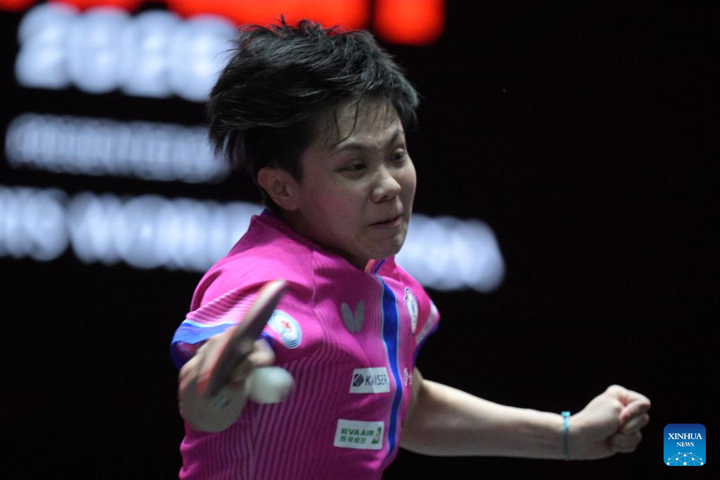 Cheng I-Ching of Chinese Taipei hits a return during the women's singles round of 32 match between Wang Manyu of China and Cheng I-Ching of Chinese Taipei at the World Table Tennis (WTT) Singapore Smash 2026 in Singapore on Feb. 24, 2026. (Photo by Then Chih Wey/Xinhua)