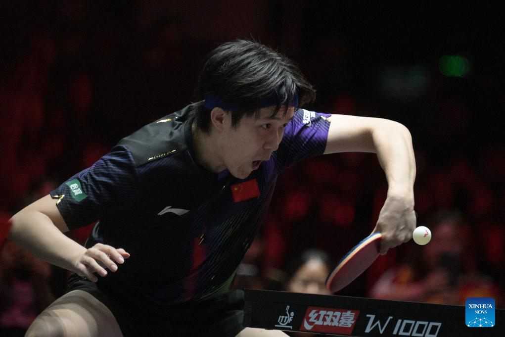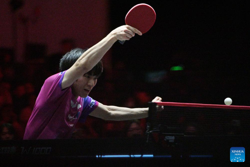Wang Chuqin of China hits a return during the men's singles round of 32 match between Wang Chuqin of China and Togami Shunsuke of Japan at the World Table Tennis (WTT) Singapore Smash 2026 in Singapore on Feb. 24, 2026. (Photo by Then Chih Wey/Xinhua)