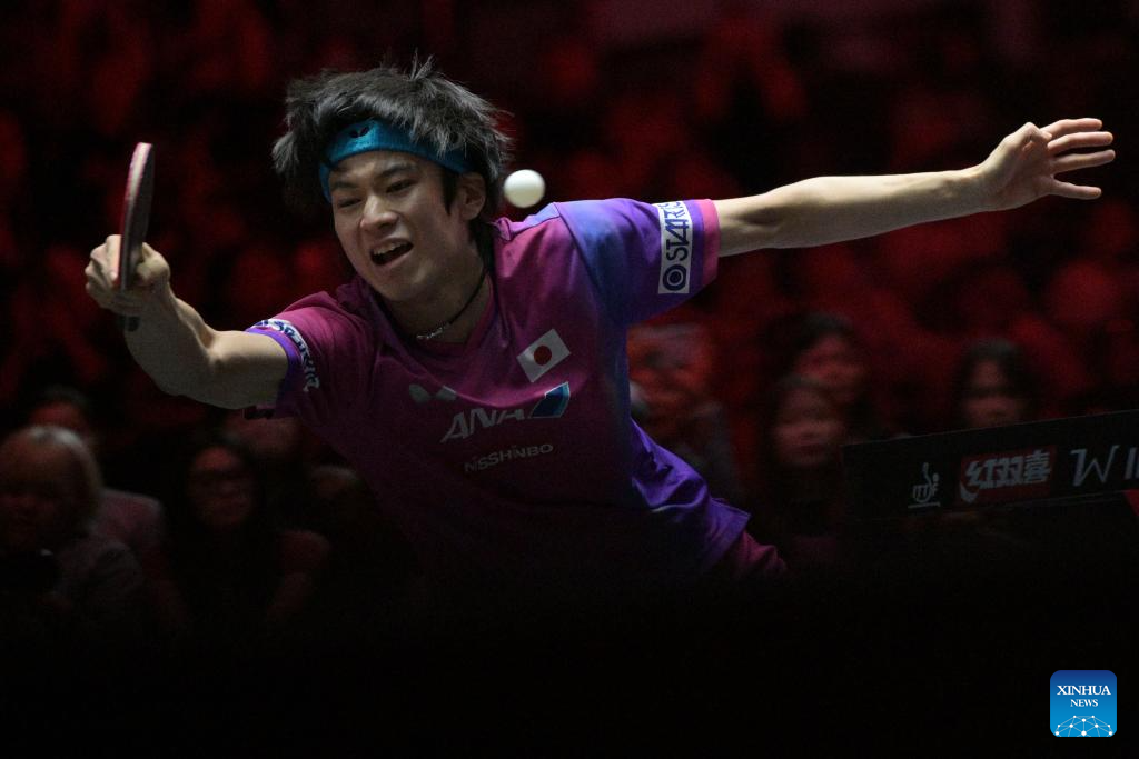 Togami Shunsuke of Japan hits a return during the men's singles round of 32 match between Wang Chuqin of China and Togami Shunsuke of Japan at the World Table Tennis (WTT) Singapore Smash 2026 in Singapore on Feb. 24, 2026. (Photo by Then Chih Wey/Xinhua)