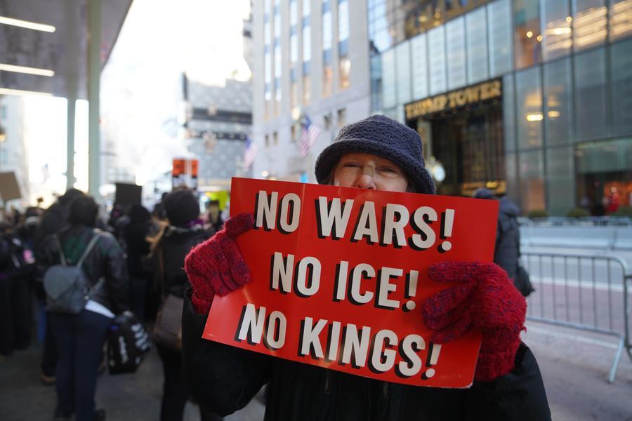 A woman attends a protest in New York, the United States, on Jan. 20, 2026. (Xinhua/Zhang Fengguo)